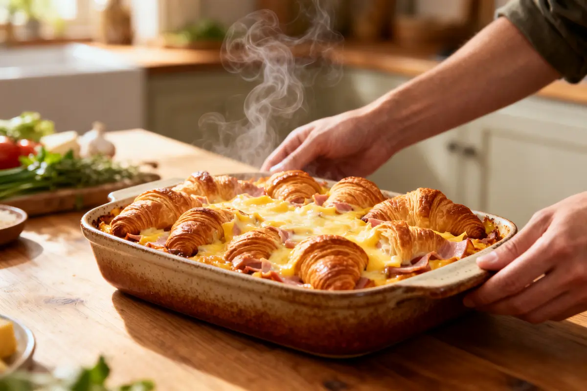 Een warme ovenschotel die ruikt naar vers gebakken croissants, zachte kaas[…]