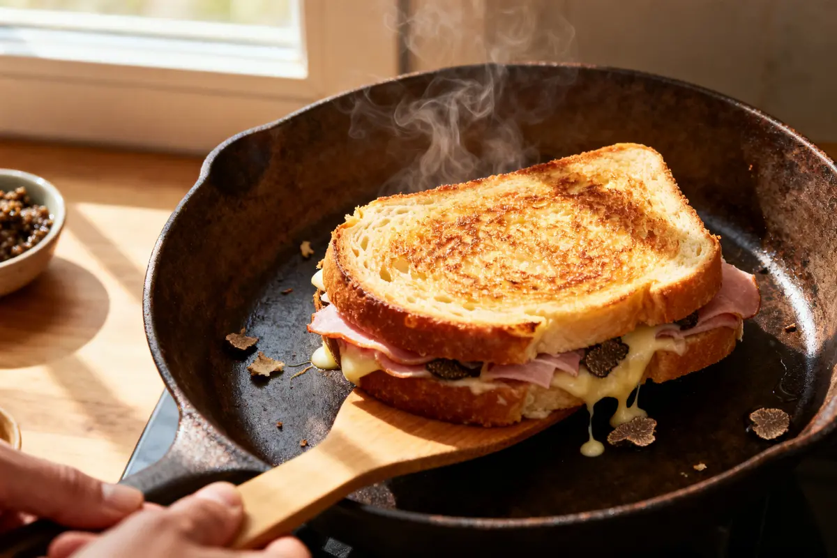 Deze tosti is al rijk van zichzelf, dus houd de rest simpel. Een kleine salade met olijfolie en citroen past er goed bij. Ook een kop warme tomatensoep werkt uitstekend. De zachte smaak van tomaat maakt de truffel minder zwaar.